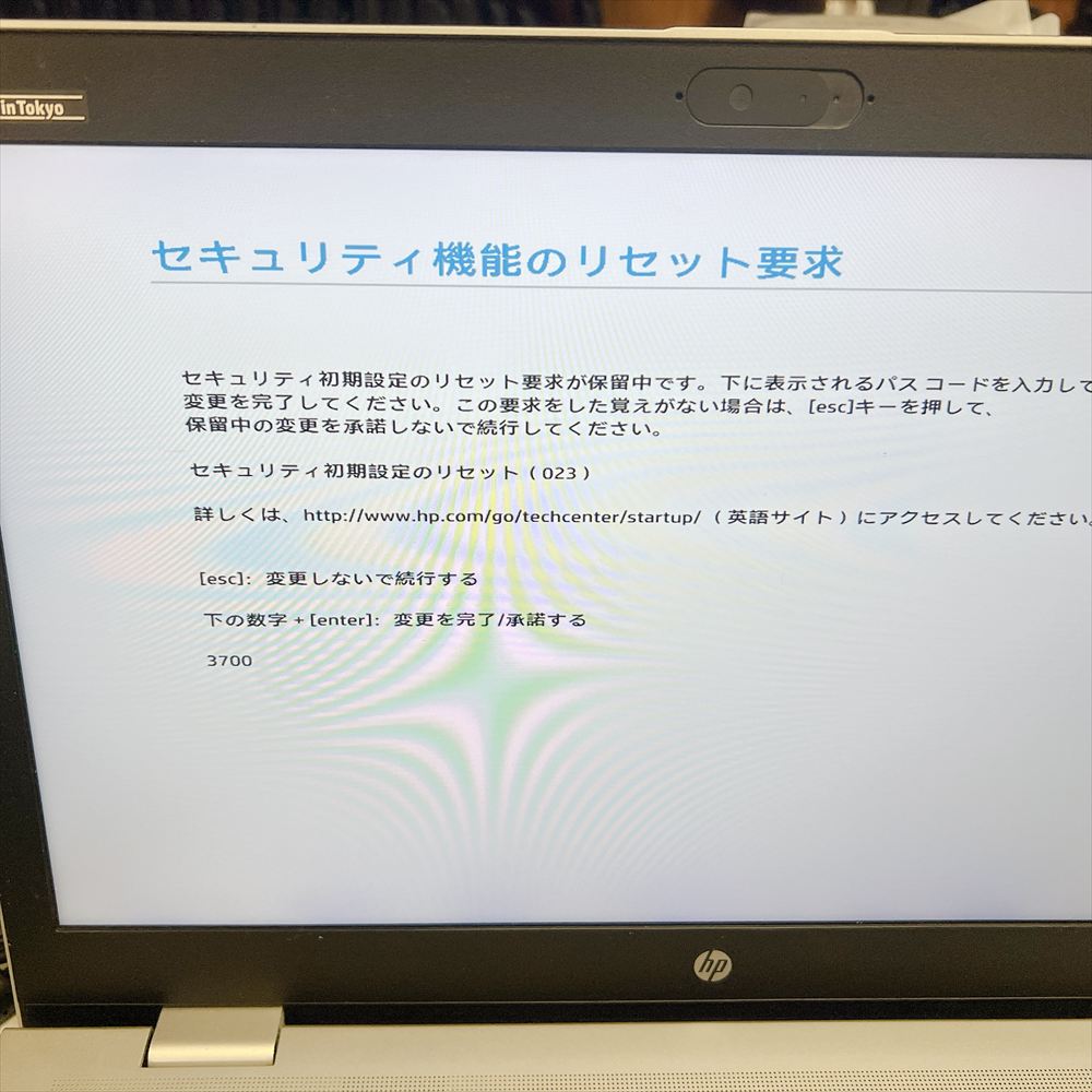 2時間後くらいに電話があり、解除方法を教えていただくと、BIOSの「セキュリティ設定を工場出荷時設定に復元する」ことで解除できるとのことでした